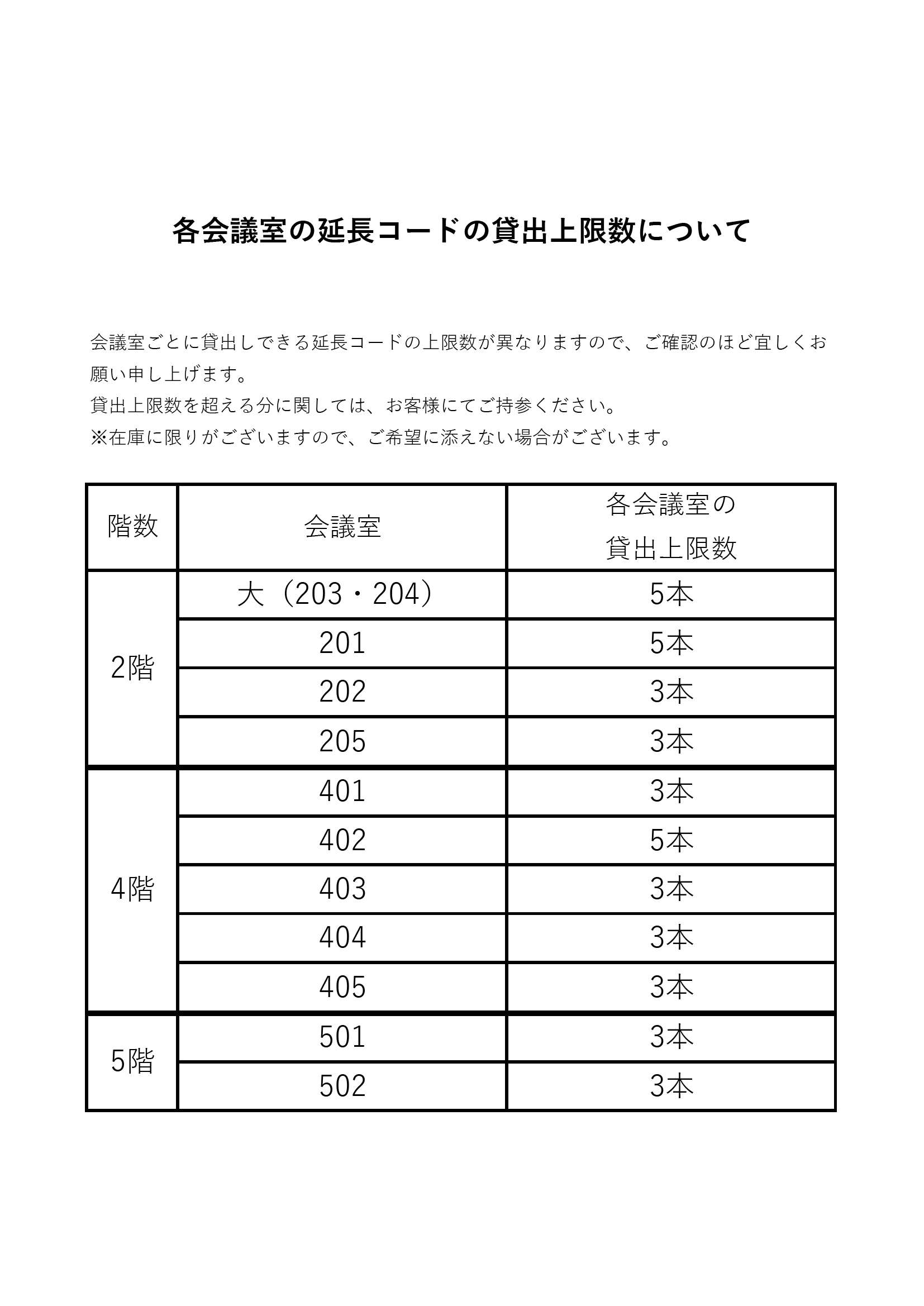【お知らせ】延長コードの貸出上限数のご案内 2023年4月4日 更新 会議室ごとに貸出しできる延長コードの上限数が異なりますので、ご確認のほど宜しくお願い申し上げます。 ご不明点がございましたら、下記連絡先にお問い合わせください。 電話:03-3253-1771 各会議室の延長コードの貸出上限数について