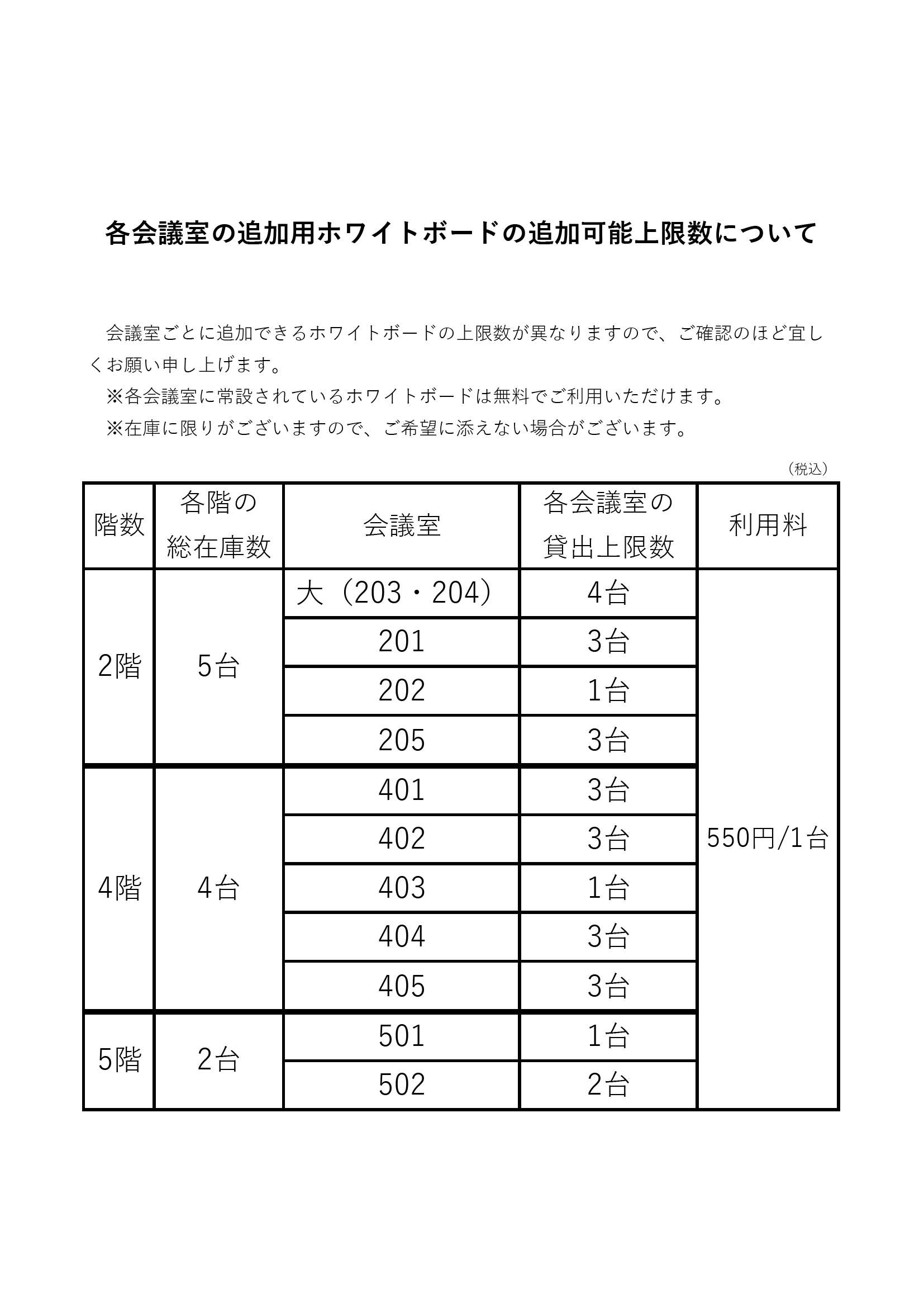 【お知らせ】各会議室の追加ホワイトボードの追加可能上限数のご案内